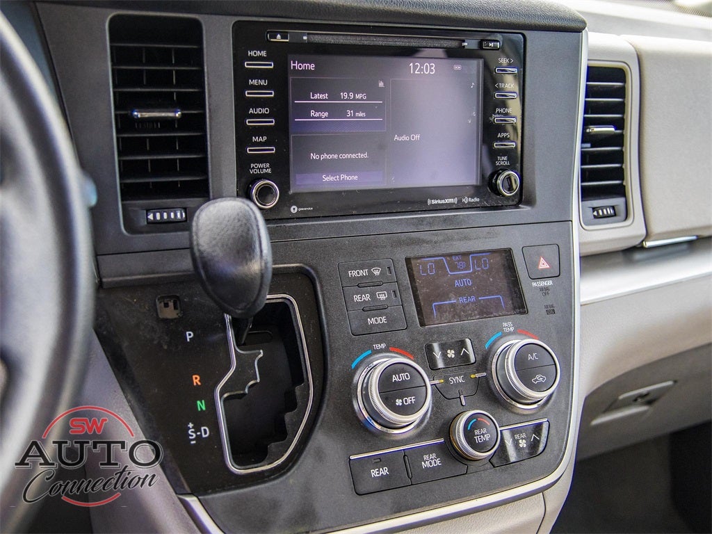 2020 Parisian Night Pearl Toyota Sienna LE FWD 3.5L V6 SMPI DOHC 8-Speed Automatic This Toyota Sienna has many features and is well equipped including, 17 5-Spoke Alloy Wheels, 3rd row seats: split-bench, 4-Wheel Disc Brakes, 6 Speakers, ABS brakes, Air Conditioning, AM/FM radio: SiriusXM, Apple CarPlay, Auto High-beam Headlights, Auto-dimming Rear-View mirror, Automatic temperature control, Axle Ratio: 3.003, Brake assist, Bumpers: body-color, CD player, Compass, Delay-off headlights, Door auto-latch, Driver door bin, Driver vanity mirror, Driver's Seat Mounted Armrest, Dual front impact airbags, Dual front side impact airbags, Electronic Stability Control, Exterior Parking Camera Rear, Fabric Seat Material, Front anti-roll bar, Front Bucket Seats, Front dual zone A/C, Front reading lights, Front wheel independent suspension, Fully automatic headlights, Garage door transmitter: HomeLink, Heated door mirrors, Illuminated entry, Knee airbag, Low tire pressure warning, Occupant sensing airbag, Outside temperature display, Overhead airbag, Overhead console, Panic alarm, Passenger door bin, Passenger seat mounted armrest, Passenger vanity mirror, Power door mirrors, Power driver seat, Power steering, Power windows, Radio data system, Radio: Entune 3.0 Audio Plus w/App Suite, Rear air conditioning, Rear anti-roll bar, Rear reading lights, Rear window defroster, Rear window wiper, Reclining 3rd row seat, Remote keyless entry, Roof rack: rails only, Speed control, Speed-sensing steering, Split folding rear seat, Spoiler, Steering wheel mounted audio controls, Tachometer, Telescoping steering wheel, Tilt steering wheel, Traction control, Trip computer, Variably intermittent wipers.