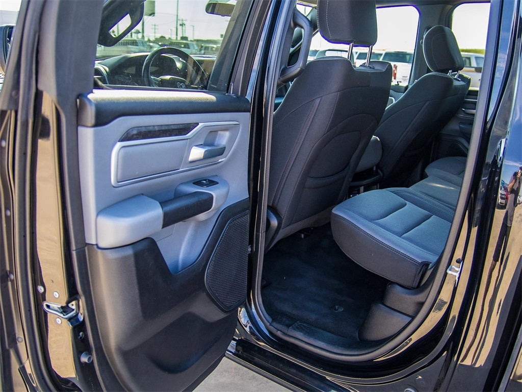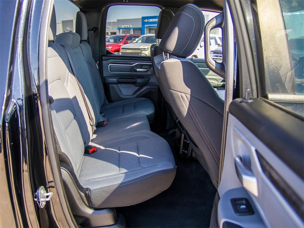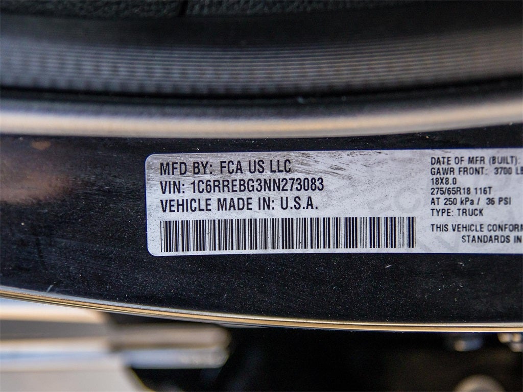 Certified. 2022 Diamond Black Crystal Pearlcoat Ram 1500 Big Horn RWD 8-Speed Automatic 3.6L V6 24V VVT This Ram 1500 has many features and is well equipped including, Lifetime Engine Guarantee, Lifetime Oil Changes, 3 Rear Seat Head Restraints, 4 Way Front Headrests, 4-Wheel Disc Brakes, 48V Belt Starter Generator, 6 Speakers, ABS brakes, Air Conditioning, Alloy wheels, AM/FM radio, Big Horn Badge, Black Exterior Mirrors, Brake assist, Bumpers: chrome, Cloth Bench Seat, Compass, Convex Wide-Angle Mirror Insert, Delay-off headlights, Driver door bin, Dual front impact airbags, Dual front side impact airbags, Electronic Stability Control, Emergency communication system: SiriusXM Guardian, Front anti-roll bar, Front Center Armrest w/Storage, Front fog lights, Front reading lights, Front Seat Back Map Pockets, Front wheel independent suspension, Fully automatic headlights, Global Telematics Box Module (TBM), GPS Antenna Input, Heated door mirrors, Illuminated entry, Integrated Voice Command w/Bluetooth®, Leather steering wheel, Low tire pressure warning, Manual Adjust 4-Way Front Passenger Seat, Occupant sensing airbag, Outside temperature display, Overhead airbag, Overhead console, Panic alarm, ParkView Rear Back-Up Camera, Passenger door bin, Passenger vanity mirror, Power door mirrors, Power steering, Power windows, Quick Order Package 23Z Big Horn, Radio data system, Radio: Uconnect 3 w/5 Display, Rear 60/40 Folding Seat, Rear anti-roll bar, Rear seat center armrest, Rear step bumper, Remote keyless entry, Speed control, Split folding rear seat, Steering wheel mounted audio controls, Tachometer, Telescoping steering wheel, Tilt steering wheel, Traction control, Trip computer, Variably intermittent wipers, Voltmeter.