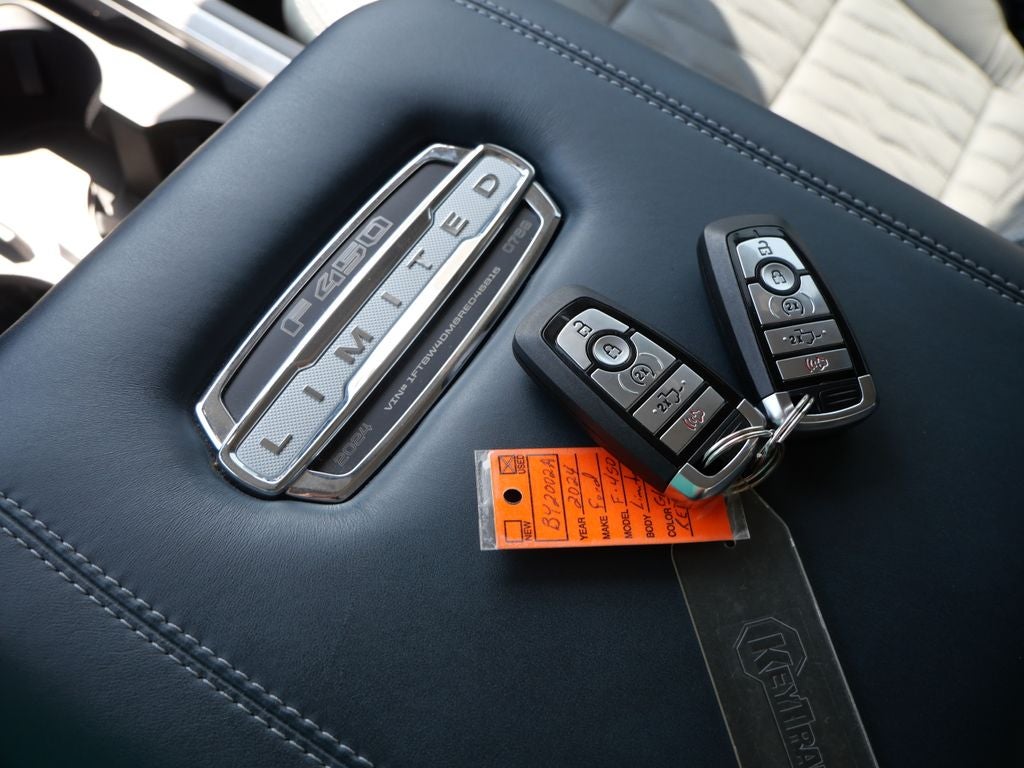 2024 Gray Metallic Ford F-450SD Limited 4WD 6.7L High Output Power Stroke V8 Diesel This Ford F-450SD has many features and is well equipped including, 4WD, 19.5 Forged Polished Aluminum Wheels, 4-Wheel Disc Brakes, ABS brakes, Adjustable pedals, Alloy wheels, AM/FM radio: SiriusXM with 360L, Auto High-beam Headlights, Auto tilt-away steering wheel, Auto-dimming Rear-View mirror, Automatic temperature control, Brake assist, Compass, Delay-off headlights, Driver door bin, Driver vanity mirror, Dual front impact airbags, Dual front side impact airbags, Dual rear wheels, Electronic Stability Control, Emergency communication system: SYNC 4 911 Assist, Engine Block Heater, Exterior Parking Camera Rear, Flow-Through Console, Front anti-roll bar, Front Bucket Seats, Front Center Armrest, Front dual zone A/C, Front fog lights, Front reading lights, Fully automatic headlights, Garage door transmitter, GVWR: 14,000 lb Payload Package, Heated door mirrors, Heated front seats, Heated rear seats, Heated steering wheel, Illuminated entry, Leather steering wheel, Limited Slip w/4.30 Axle Ratio, Memory seat, Navigation system: Connected Navigation (includes complimentary 1-year trial), Outside temperature display, Overhead airbag, Overhead console, Panic alarm, Passenger door bin, Passenger vanity mirror, Pedal memory, Power door mirrors, Power driver seat, Power passenger seat, Power steering, Power windows, Radio: B&O Unleashed Sound System by Bang & Olufsen, Rain sensing wipers, Rapid-Heat Supplemental Cab Heater, Rear anti-roll bar, Rear reading lights, Rear seat center armrest, Rear step bumper, Rear window defroster, Remote keyless entry, Security system, SiriusXM Radio w/360L, Speed control, Split folding rear seat, Steering wheel memory, Steering wheel mounted audio controls, SYNC 4 w/Enhanced Voice Recognition, Tachometer, Telescoping steering wheel, Tilt steering wheel, Traction control, Trip computer, Turn signal indicator mirrors, Variably intermittent wipers, Vehicle Safe by Console Vault (Pre-Installed), Ventilated front seats.