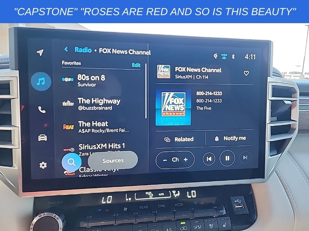 2024 Toyota Sequoia Capstone 4WD V6 Hybrid This Toyota Sequoia has many features and is well equipped including, Leather Seats, Heated and Cooled Seats, Navigation System, Backup Camera, Keyless Access with Push Button Start, Keyless Entry, Navigation/GPS, Tow Package, AWD/4X4/ALL WHEEL DRIVE/4WD, V6 Hybrid, 10-Speed Automatic, 4WD, 14 Speakers, 3.31 Axle Ratio, 3rd row seats: split-bench, 4-Wheel Disc Brakes, ABS brakes, Air Conditioning, Alloy wheels, AM/FM radio: SiriusXM, Anti-whiplash front head restraints, Apple CarPlay/Android Auto, Auto High-beam Headlights, Auto tilt-away steering wheel, Auto-dimming door mirrors, Auto-dimming Rear-View mirror, Automatic Power Extending Running Boards, Automatic temperature control, Brake assist, Bumpers: body-color, Compass, Delay-off headlights, Driver door bin, Driver vanity mirror, Dual front impact airbags, Dual front side impact airbags, Electronic Stability Control, Emergency communication system: Safety Connect (10-year trial), Exterior Parking Camera Rear, Front anti-roll bar, Front Bucket Seats, Front Center Armrest w/Storage, Front dual zone A/C, Front fog lights, Front reading lights, Front wheel independent suspension, Fully automatic headlights, Garage door transmitter: HomeLink, Genuine wood door panel insert, Head Up Display (HUD), Headlight cleaning, Heads-Up Display, Heated & Ventilated Front Seats, Heated door mirrors, Heated front seats, Heated Power Auto-Dimming Outside Mirrors, Heated rear seats, Heated steering wheel, Illuminated entry, Knee airbag, Leather Shift Knob, Leather steering wheel, Low tire pressure warning, Memory seat, Navigation system: Drive Connect (1 year trial) includes Cloud Navigation with real time traffic and Google POI, Occupant sensing airbag, Outside temperature display, Overhead airbag, Overhead console, Panic alarm, Passenger door bin, Passenger vanity mirror, Power door mirrors, Power driver seat, Power Liftgate, Power moonroof, Power passenger seat, Power steering, Power windows, Premium audio system: JBL, Radio: JBL Premium Audio System, Rain sensing wipers, Rear air conditioning, Rear reading lights, Rear seat center armrest, Rear window defroster, Rear window wiper, Reclining 3rd row seat, Remote keyless entry, Security system, Semi-Aniline Leather Seat Trim, Speed control, Speed-sensing steering, Split folding rear seat, Spoiler, Sport steering wheel, Steering wheel mounted audio controls, Tachometer, Telescoping steering wheel, Tilt steering wheel, Traction control, Trip computer, Turn signal indicator mirrors, Variably intermittent wipers, Ventilated front seats, Ventilated rear seats, Voltmeter, Wheels: 20 Machined-Finish Black Alloy.